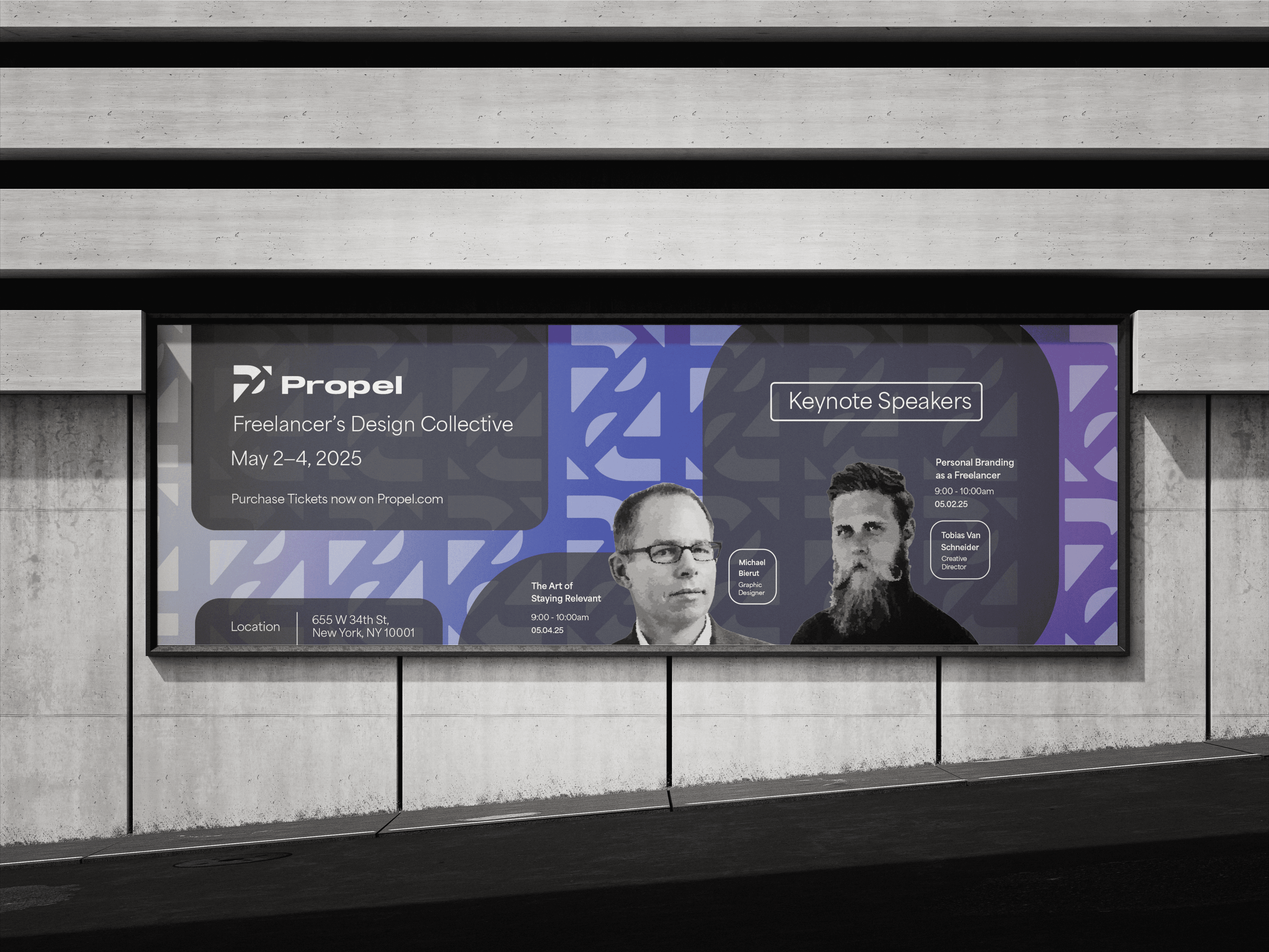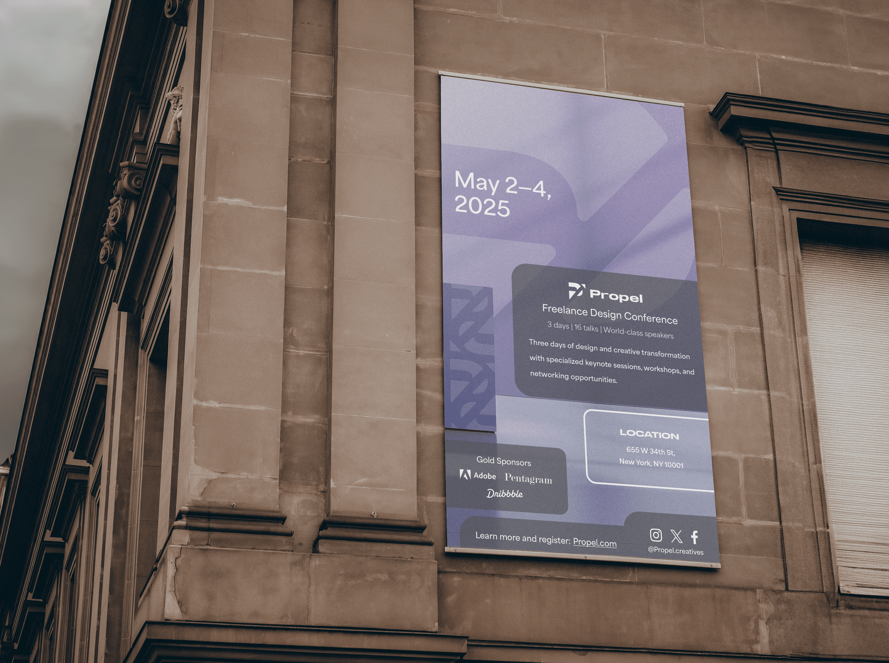 Building on my previous project, where I developed the Propel design campaign, our task was to create a library of visual assets derived from the event logo’s attributes. These assets were applied across various event materials, including a program, double-sided poster, vertical banner, textile, sticker series, lanyard, and exterior signage.